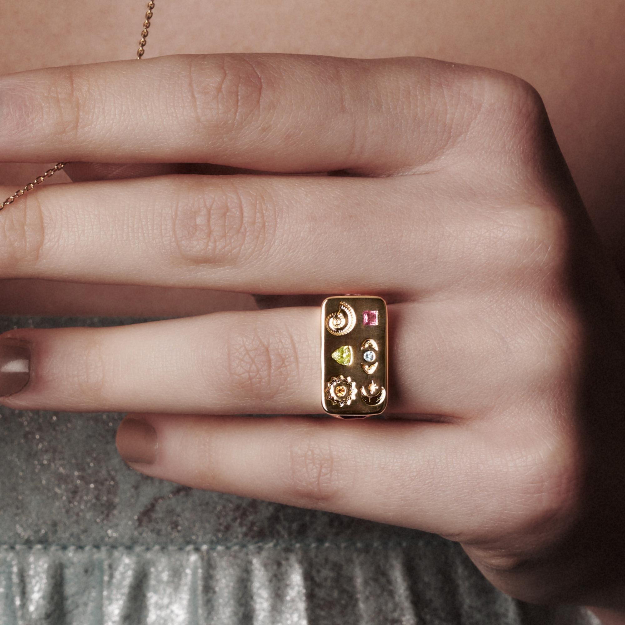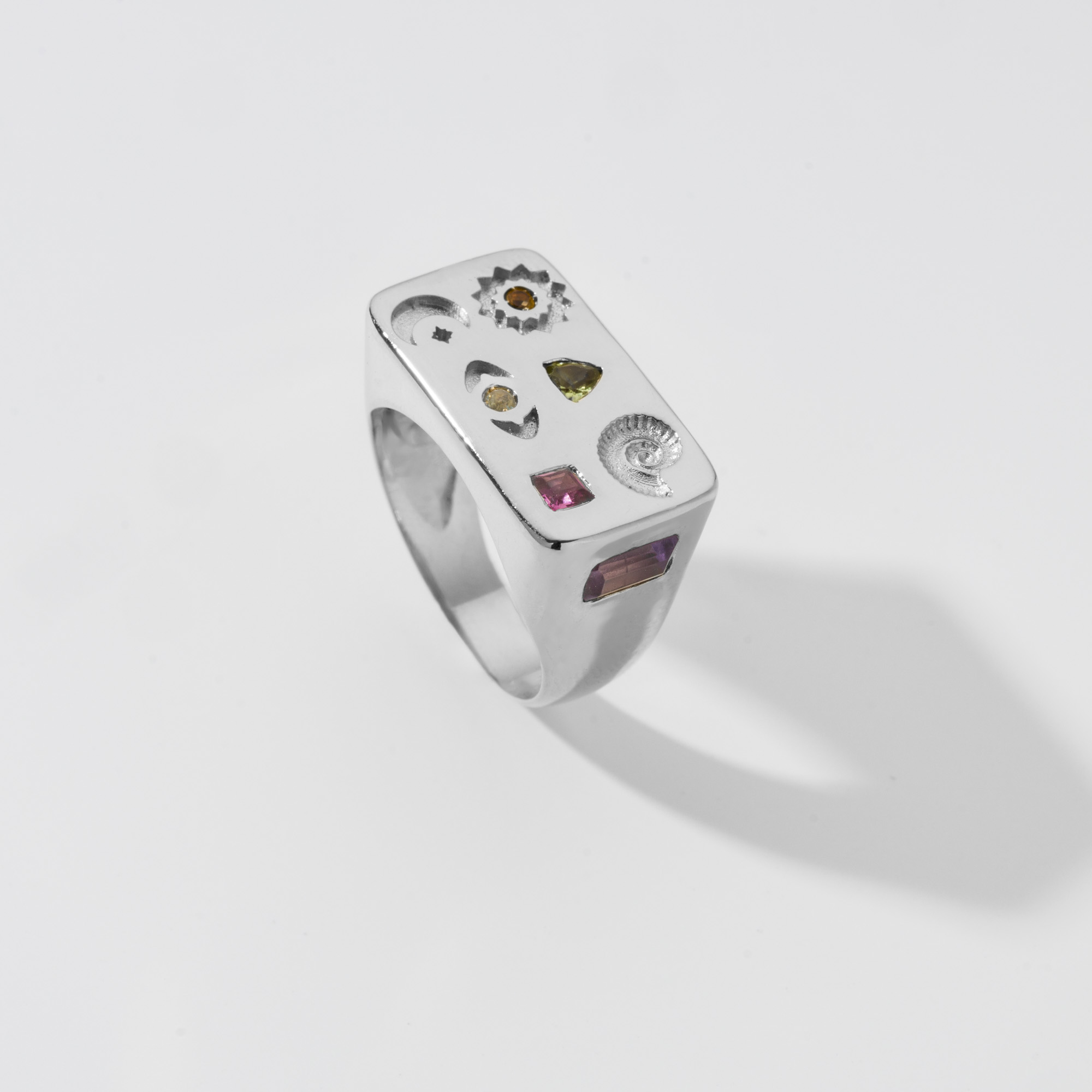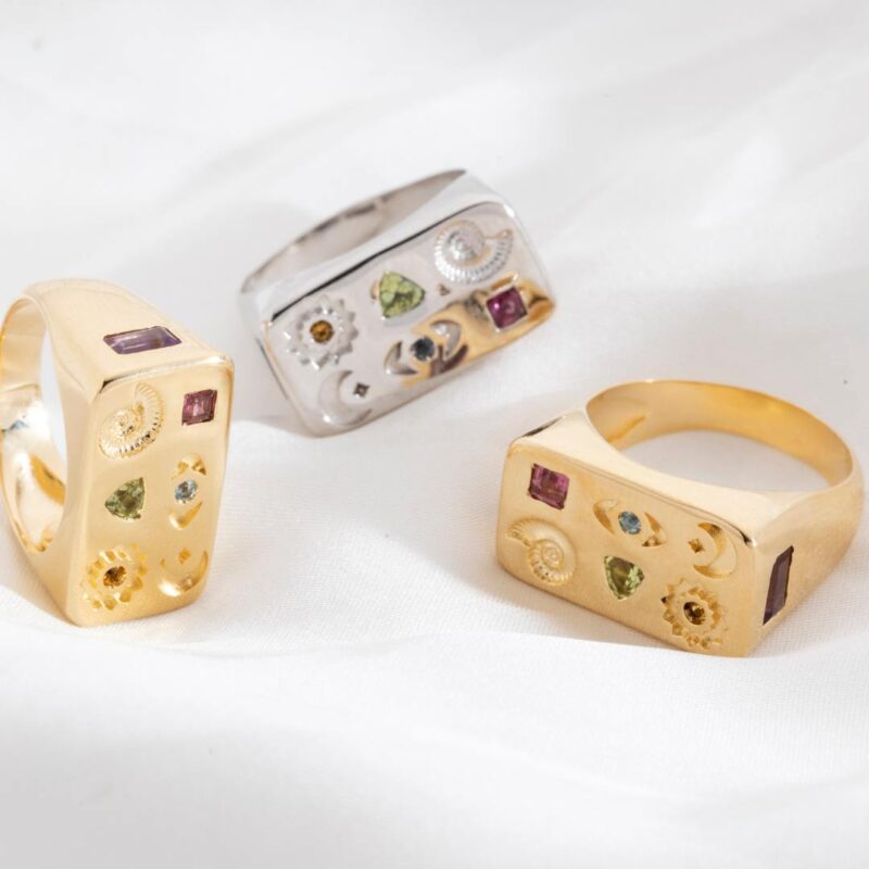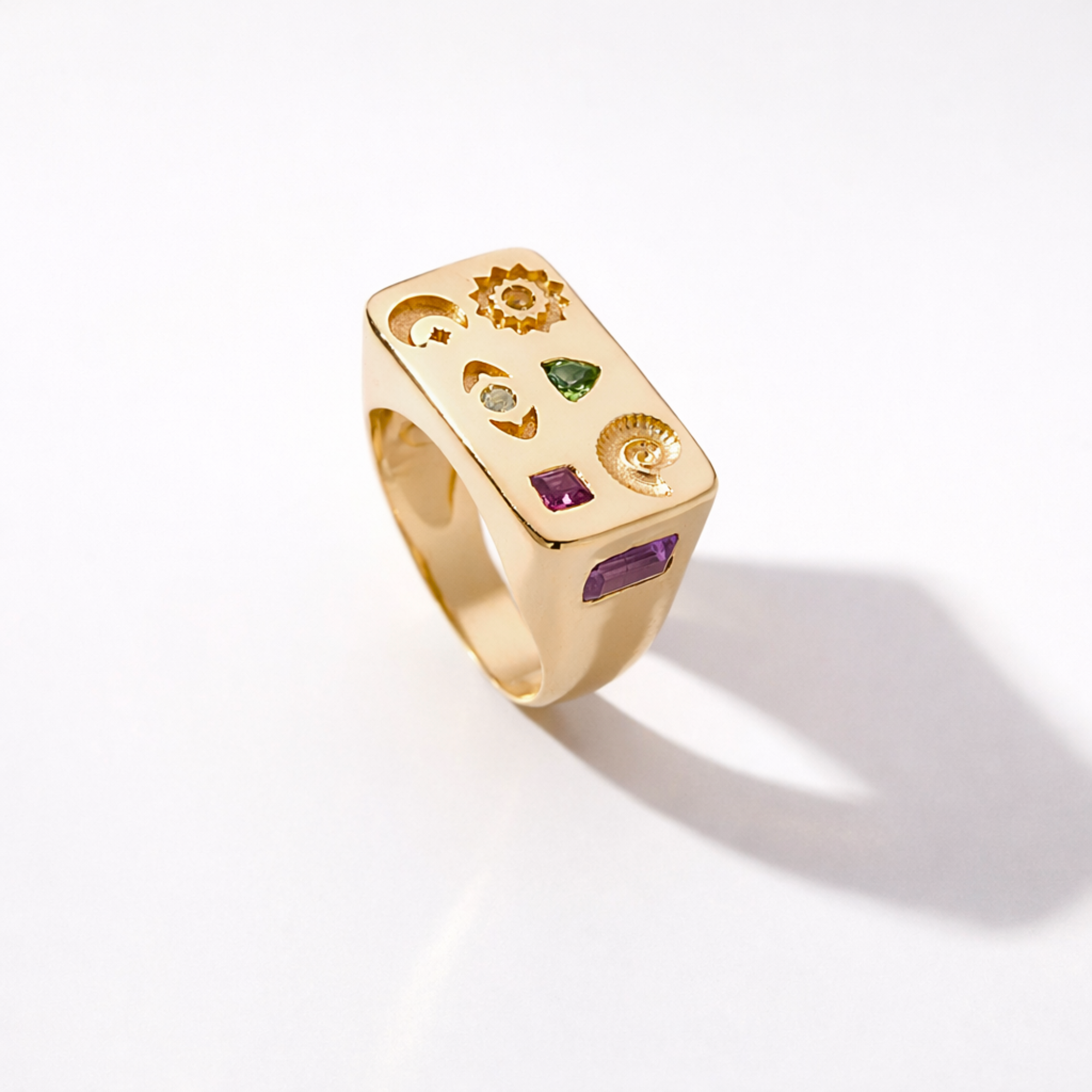 Nosso anel Sinete carrega parte de símbolos importantes da mitologia grega, e que marcaram também a nossa coleção: Concha, Olho Grego, Sol, Lua e Estrela.