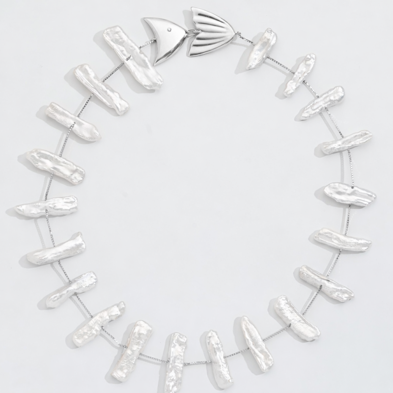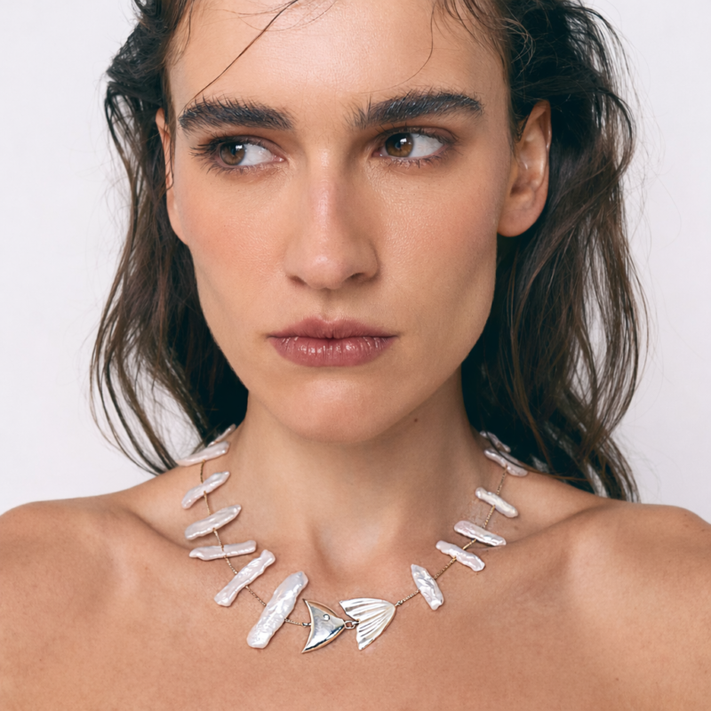 O nosso Colar Fishbone possui as pérolas barrocas naturais, com formatos muito específicos, como elemento central. Elas juntas, e posicionadas com intenção, formam o desenho de uma espinha de peixe, gerando um efeito exuberante e elegante.