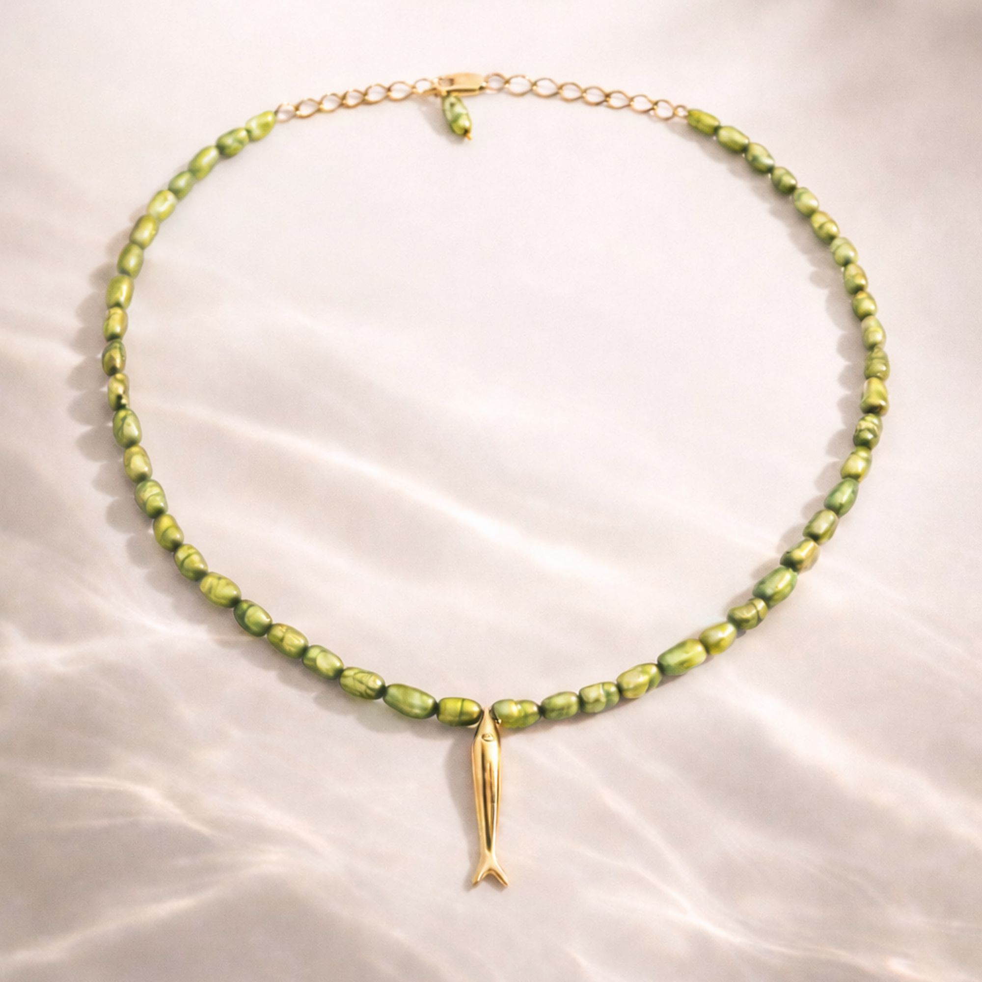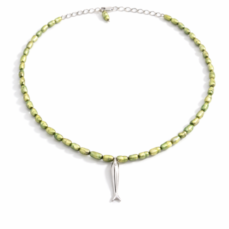 Pedra: Pérolas naturais coloridas de 4mm com pingente fixo e centralizado de sardinha.