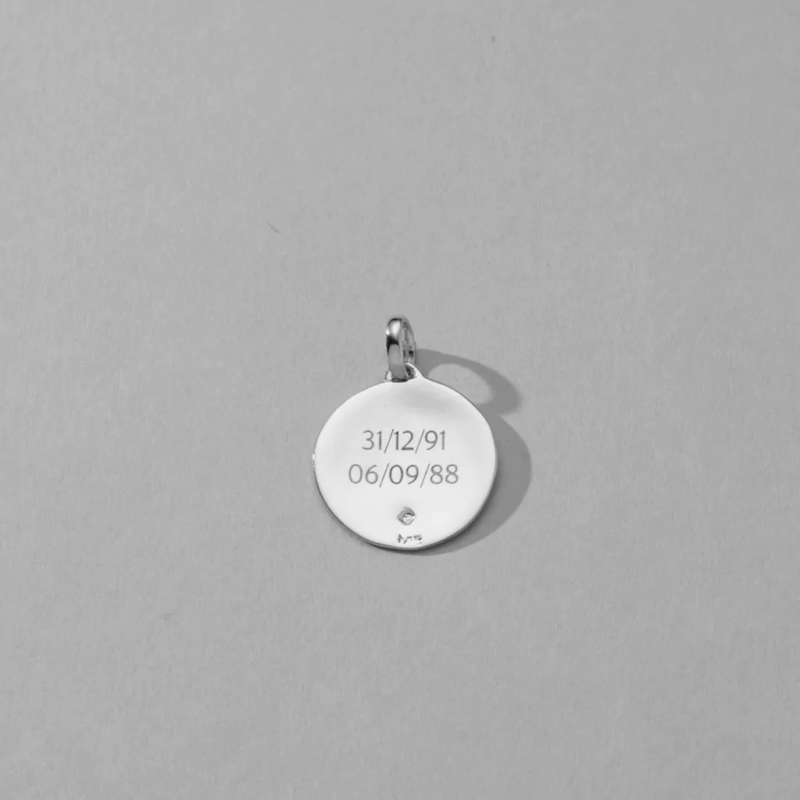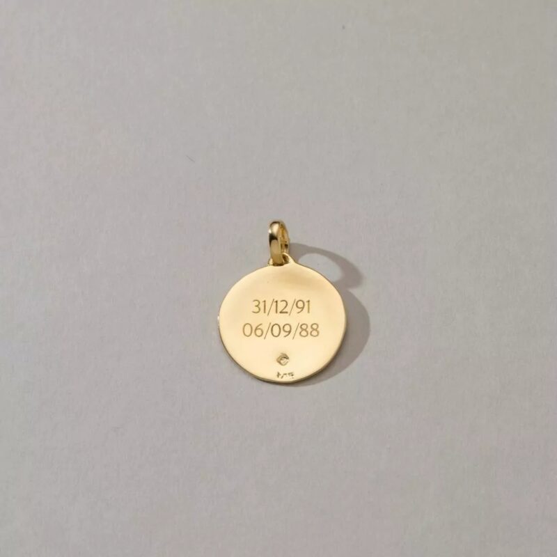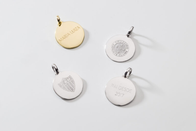 - Você pode optar por gravar uma frase de até 5 palavras em cada lado da medalha. Mas pode ser também apenas uma inicial, ou um nome, ou uma data.